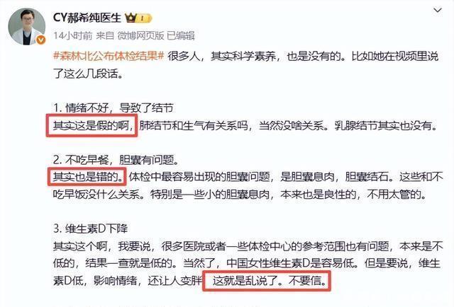 不过这个时候就有网友发文反驳她,而且这个网友的网名还是医生。 他从三个方面反驳了森林北,反正就是说她的这些毛病根本就不是引起她亚健康的关键。